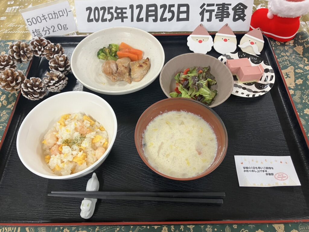 2025年12月の行事食はこちら えびピラフ 照り焼きチキン シーザーサラダ 豆乳クリームスープ クリスマスデザート ☆☆患者様からのお声を頂きました(^^)☆☆ ★お腹いっぱいになりました。 ★ピラフとスープが一番美味しかった。 ★いつもおいしくいただいております。今後もよろしくお願いします。