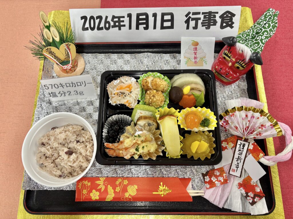 2026年1月の行事食はこちら 赤飯 黒豆 三種盛り(海老マヨ、テリーヌ、チキン) 煮しめ きんかん 栗きんとん 紅白なます あられ団子 りんご ☆☆患者様からのお声を頂きました(^^)☆☆ ★御節料理を病院で頂けるとは思ってもいませんでした。とっても美味しかったです。栄養部の御配慮に感謝します。ありがとうございました。 ★見ただけで美味しそうでした。ありがとうございます。